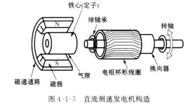 如圖4-1-5所示,直流測速發(fā)電機的定子是永久磁鐵,轉(zhuǎn)子是線圈繞組。它的 原理和永久磁鐵的直流發(fā)電機相同,轉(zhuǎn)子產(chǎn)生的電壓通過換向器和電刷以直流電 壓的形式輸出,可以測量0~10000r/min 量J的旋轉(zhuǎn)速度,線性度為0 . 1 % 。 此 外,停機時不易產(chǎn)生殘留電壓,因此,它Z適宜作速度傳感器。但是電刷部分是機械接觸,需要注意維修,另外,換向器在切換時產(chǎn)生脈動電壓,使測量精度降低。因 此,現(xiàn)在亦有用無刷直流測速發(fā)電機。