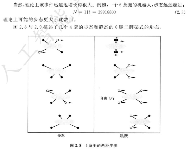 對于多腿移動機器人,存在運動時腿的協調或步態控制問題。可能的步態數目 依賴于腿的數目[52]。對單條腿而言,步態是抬起與放下事件的序列。對一個有 k 條 腿的移動機器人,步行機器可能事件的總數N 為