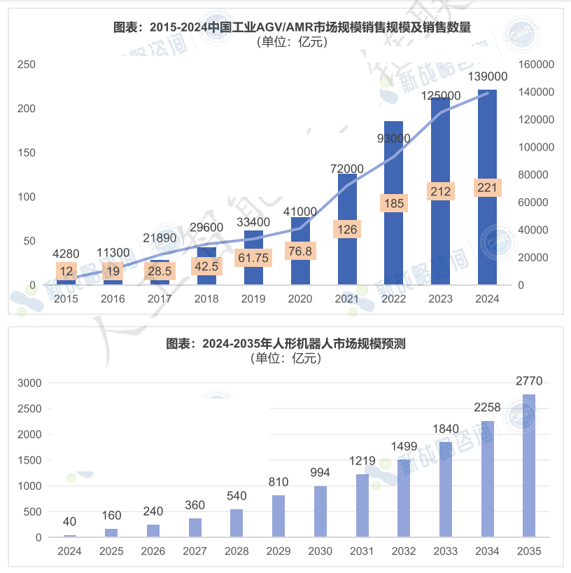根據(jù)新戰(zhàn)略移動(dòng)機(jī)器人產(chǎn)業(yè)研究所統(tǒng)計(jì), 2024年ZG工業(yè)應(yīng)用移動(dòng)機(jī)器人銷(xiāo)售規(guī)模為221億, 同比增長(zhǎng)4.25%; 銷(xiāo)售數(shù)量為139000臺(tái), 同比增長(zhǎng)1 1.2% ZG市場(chǎng)人形機(jī)器人出貨量超2800臺(tái), 市場(chǎng)規(guī)模超20億; 清潔及環(huán)衛(wèi)機(jī)器人累計(jì)出貨超12900臺(tái) (不含小型家用墻面清潔泳池清潔機(jī)器人) , 市場(chǎng)銷(xiāo)售規(guī)模約 27.6億元。 2024年, ZG智能移動(dòng)機(jī)器人整體市場(chǎng)已突破300億元。