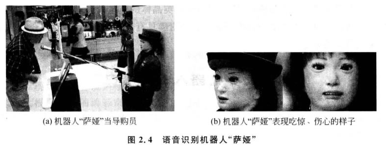 日本著名的東京高島屋商場為了解決顧客排長隊購物難的問題,引入了一款語音識 別機器人“薩婭”當導購員,如圖2.4所示。“薩婭”能夠用超過700種不同的語音方式對 購物者的問題和投訴做出反應,它會告訴顧客去哪層樓能夠買到他們所需的商品,還能 和他們閑聊幾句,但是有時也會無法“溝通”。曾有一位記者問“薩婭”問題,可能是因為 他口音太重,“薩婭”聽不懂,一直指著洗手間的方向,無法告訴記者所要去的商場樓層。 雖然“薩婭”的面部動作還存在一些不足,但是它表現高興、傷心或生氣時是很逼真的。 盡管“薩婭”是一個語音識別服務機器人,但是它像其他日本人那樣講禮貌,彬彬有禮。