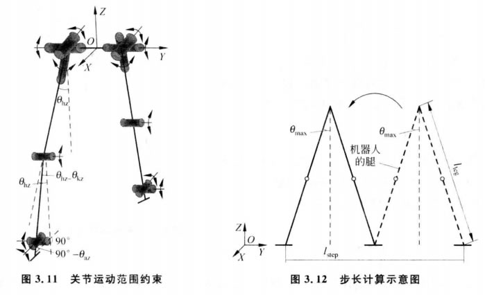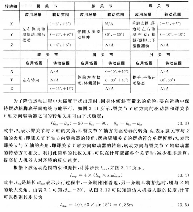 (1)運動范圍約束。智能接待智能接待機器人各個關(guān)節(jié)都有其運動范圍,需要對各個關(guān)節(jié)的運動 范圍進行約束。為了使其能夠更穩(wěn)定地步行,要分別對智能接待智能接待機器人下肢12 DOF 的運動 和上體腰及手臂等7個關(guān)節(jié)的運動進行約束。全身各個關(guān)節(jié)的運動范圍分別如表3.1 所示,由于兩條腿的運動范圍一樣,所以表3.1中沒有區(qū)分左右腿,只是按照關(guān)節(jié)來描 述。運動幅度正負的標定是以直立姿態(tài)為標準,根據(jù)關(guān)節(jié)轉(zhuǎn)動方向來定,順時針方向為 負,逆時針方向為正。