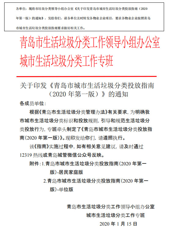 根據(jù)《青島市生活垃圾分類管理辦法》有關要求,為明確我市城市生活垃圾分類標識和投放規(guī)則,引導和規(guī)范生活垃圾分類投放行為,專班牽頭制定了《青島市城市生活垃圾分類投放指南(2020 年D一版)》。現(xiàn)印發(fā)給你們,請遵照執(zhí)行。